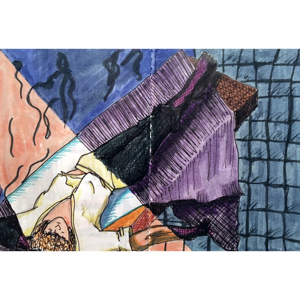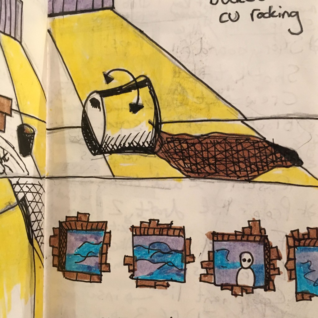 Taking some inspiration from ‘Beneficial Shock‘ a magazine that aims to interpret film through illustration, I prepared to make a visual narrative or ‘comic’ of the film to tell Shelly’s story. Using stills from the film, I drew a number of images. From these images I selected those that worked together to form a narrative or sorts. I read the film script and chose sections of dialogue that seemed particularly sexist or uncomfortable. The following image illustrate this process.