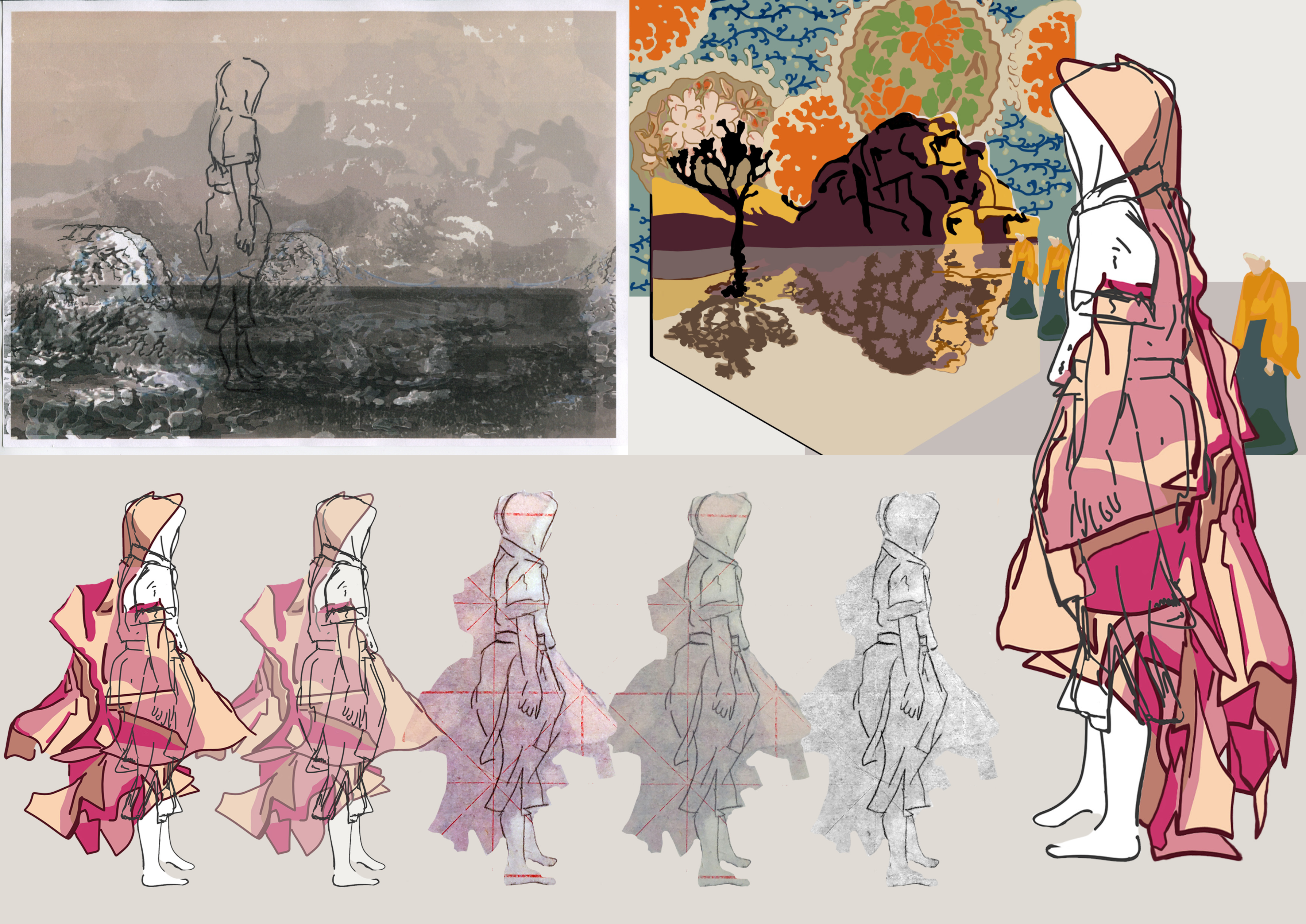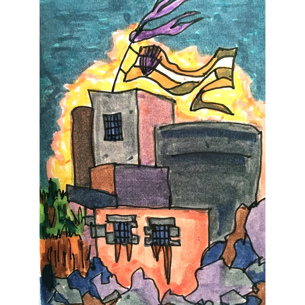 I worked on illustrating the story ‘Buffalo Gals won’t you come out tonight’ by Ursula K. Le Guin. The story evokes imagery through language moving the reader from real to unreal, employing the slippage of time and concept of inhabitated space and being. It is a short story, and I would aim to adopt the story into an illustrated narrative or graphic novel.