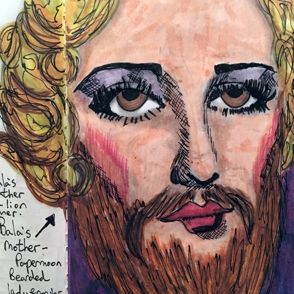 During the story of ‘Buffalo Gals won’t you come out tonight’ Myra sees her animal protectors in two different ways. With her human eye she sees them as animals, with her pitch eye she sees the animals as ‘her own people’, a humans. She is often in a state of confusion or falling, moving between the real and unreal. I think a solution to how she sees the animals during these transition stages would be for the characters to become their Kachina Doll versions. Kachina Dolls are small carved and decorated dolls made by Native Americans to represent mythological figures. The animals in the story are based on these mythological figures. Using the dolls as starting point, I have begun to illustrate and develop the animal characters.