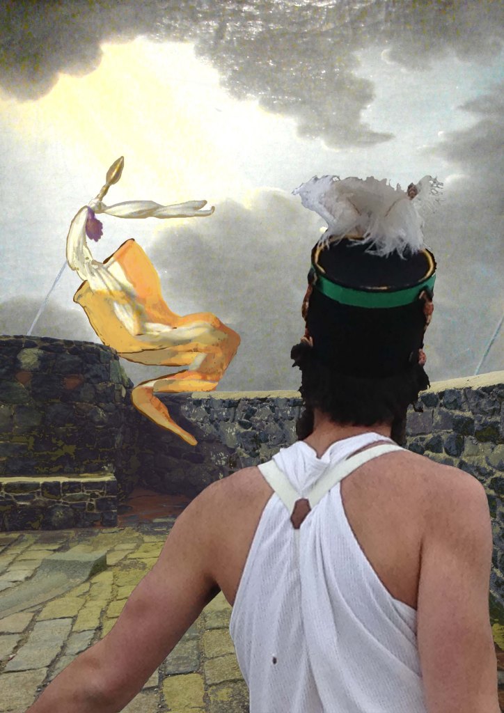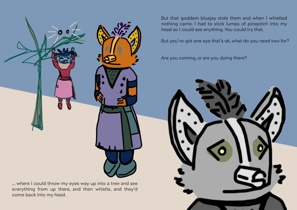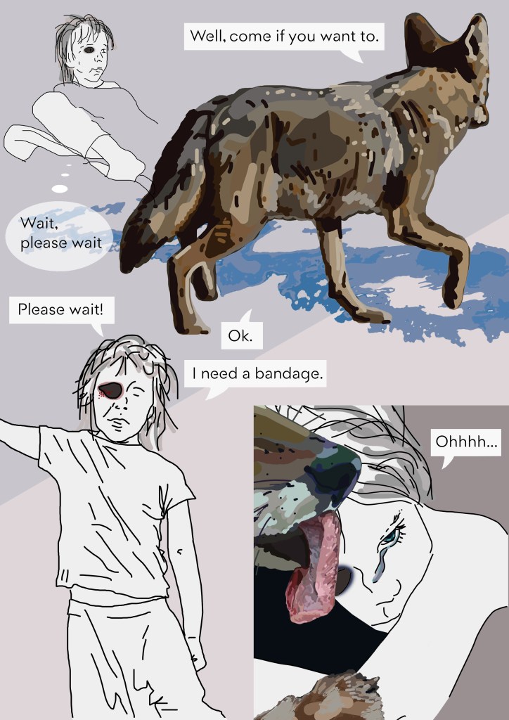 The story is of a girl that falls from the sky, from a plane flown by a man, flying her to her father. They sky is patriarchal. Myra falls from the sky into the world of the old ones. This is a world of female animals. When Myra sees through her left eye, her good eye, she sees animals. When the wound of her damaged right eye is soothed and replaced with a pitch eye, Myra sees people. Pitch eyes are a reference to a Native American origin story, where Coyote’s eyes got stuck in a tree and were replaced with pitch.