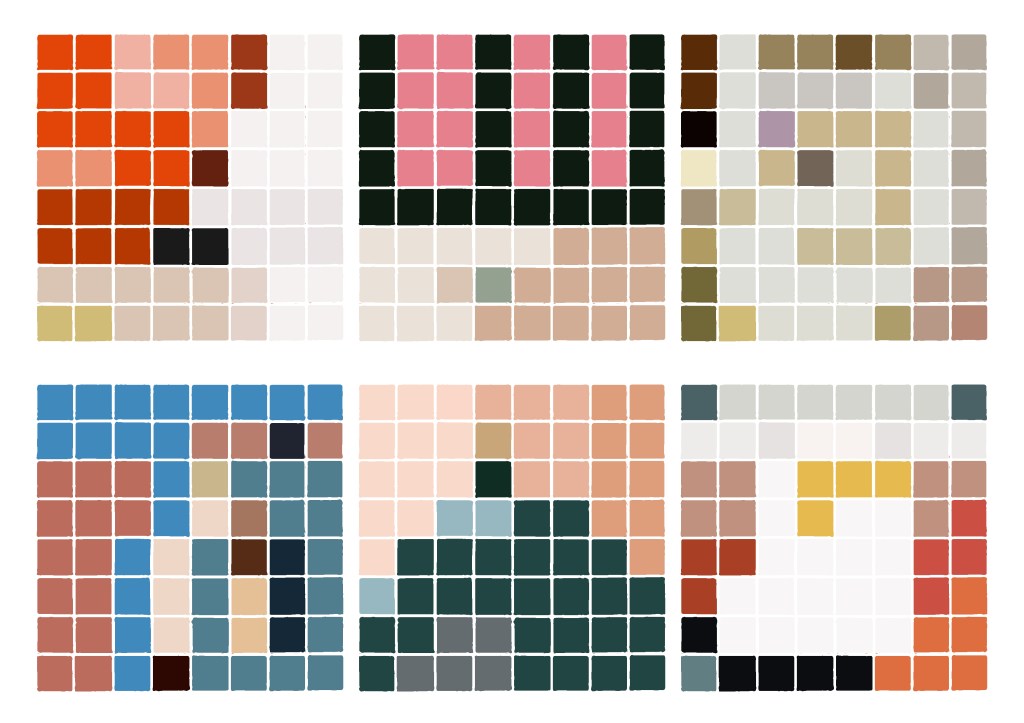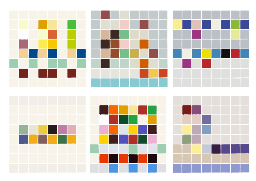 Vanderpoel used a grid of one hundred squares to analyse the colour of objects. Inspired by her method of charting colour and my interest in drawing in 8 bit I am interested in making some colour analyses in grids of 64 squares, 8 by 8..