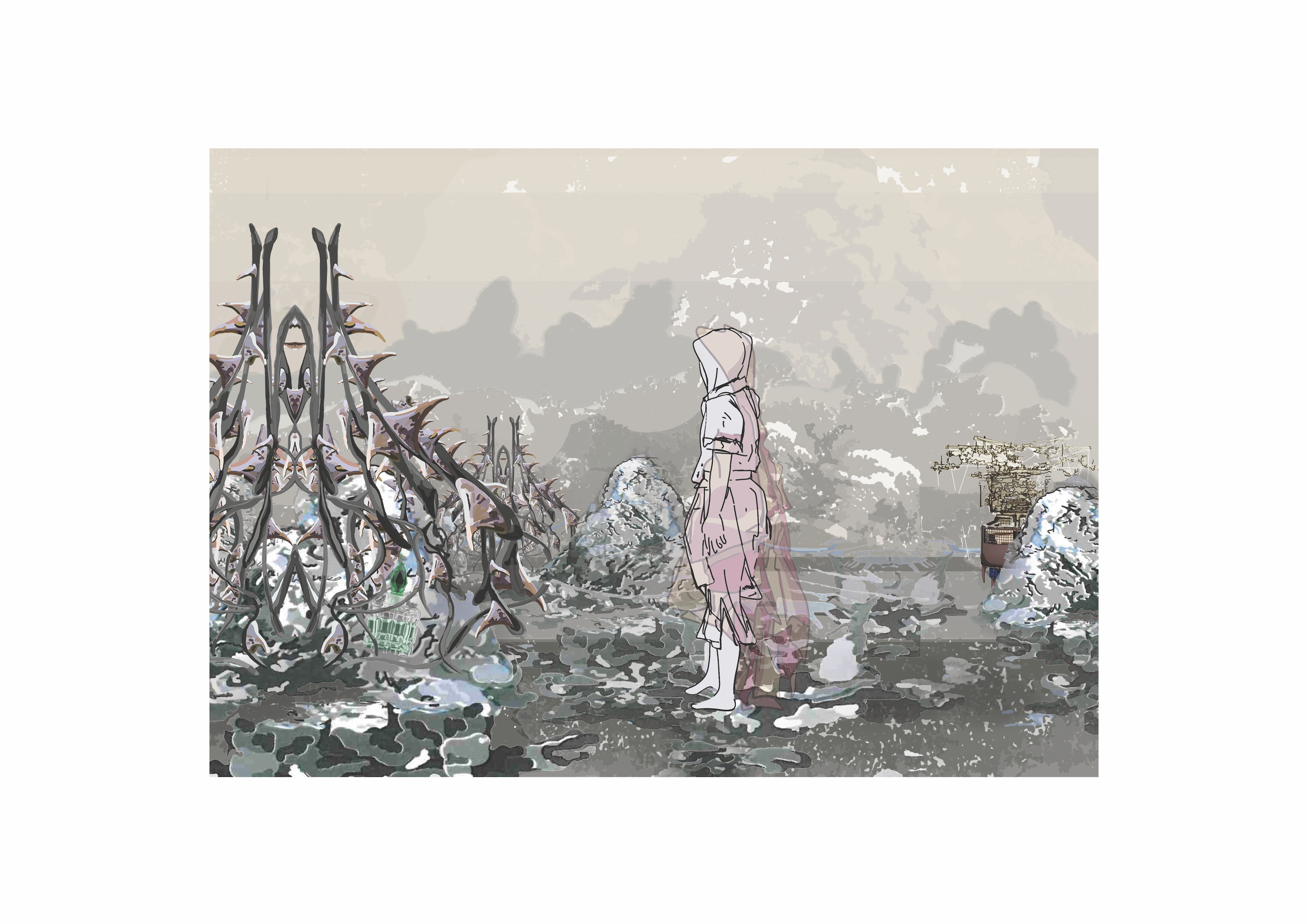 One of my foremost areas of enquiry is finding or creating a space for my voice. It has been difficult to build on spaces and voices defined by previous female practitioners. I have found it difficult to find a way of speaking that is not understood through a particular way of reading. I have explored painting, I have explored the use of textile and knit, I have explored film and photography. All wonderful vehicles for expression, but not for real communication. The message is interfered by the language of the medium. With panting and film the message struggles alongside the narratives of “feminist painting” or “female film”. Textile and knit as the feminine medium. Therefore, opening up a space for illustration in ‘digital’ or ‘video’ whose narrative is yet to be defined, is very seductive.